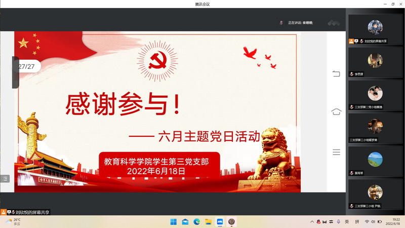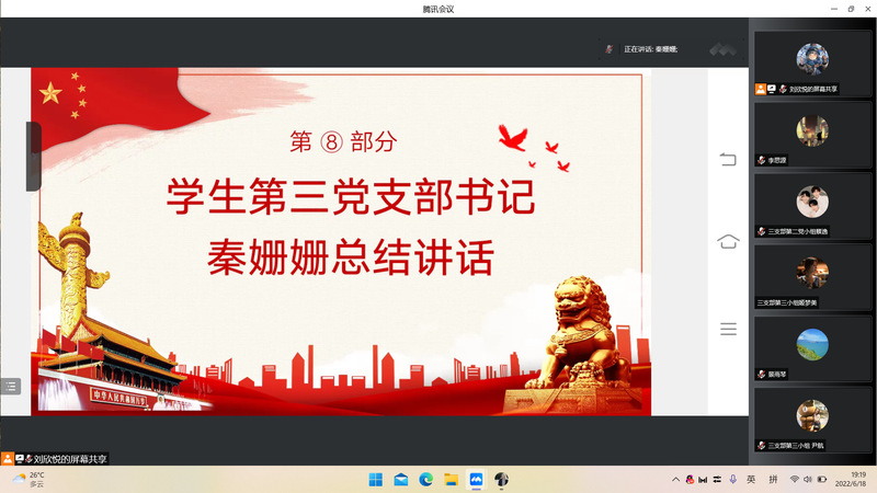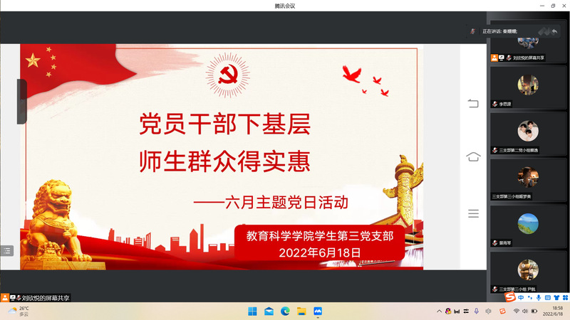 618晚上,我院学生第三党支部在腾讯会议开展了以党员干部下基层,师生群众得实惠”为主题的月主题党日活动。我院学生第三党支部全体党员参加了本次活动,活动由我院第三党支部书记秦姗姗主持。