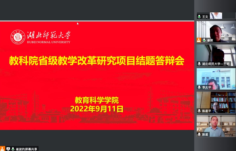 9月11日上午,教育科学学院在腾讯会议室举行了省级教学改革研究项目结题答辩会议。华中科技大学教育科学研究院副院长李太平教授、浙江师范大学陈星教授、浙江财经大学陈星平教授、湖北ty8天游平台登录王文教授和王明副教授,校教学督导杜汉生教授参与会议。会议由教育科学学院副院长崔波主持。