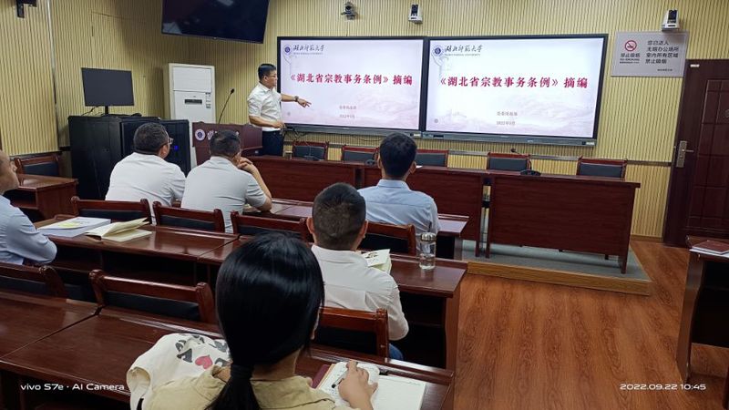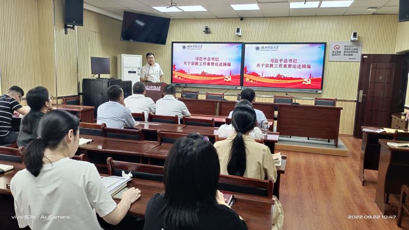 会议开始,全体党员按期缴纳了党费,重温入党誓词,学习了《党章》。随后,刘艳春分别领学了习近平在湖北、新疆、辽宁考察的重要讲话精神以及在省部级主要领导干部“学习习近平总书记重要讲话精神,迎接党的二十大”专题研讨班上的重要讲话精神,并学习了习近平在庆祝香港回归祖国25周年大会暨香港特别行政区第六届政府就职典礼上的讲话“中国好人”李培生胡晓春的回信精神。学院党总支书记徐明波领学了《高等学校新冠肺炎疫情防控技术方案(第六版))》《习近平总书记关于宗教工作重要论述(摘编)》《湖北省宗教事务条例(摘编)》《中央和省委民族工作会议精神》《全国和全省宗教工作会议精神》《共产党员不得信仰宗教等法律法规》等摘编。