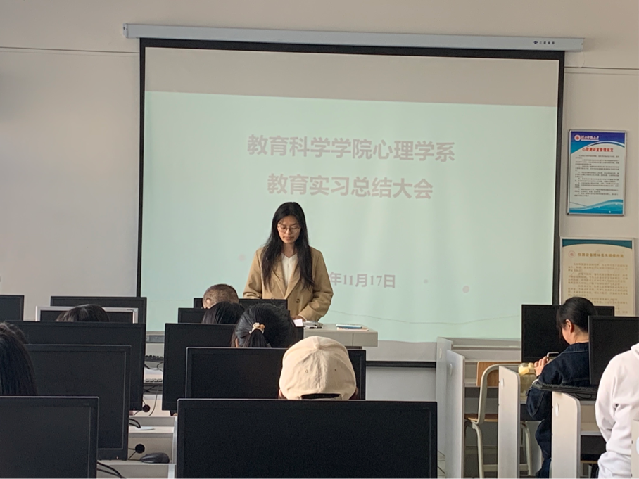 2022年11月17日下午1:30,教育科学学院2019级心理学系实习总结大会在教育大楼1713举行。会议由系主任刘艳春博士主持,实习指导教师、1902班班主任曹中保老师出席会议,1902班全体学生参与。