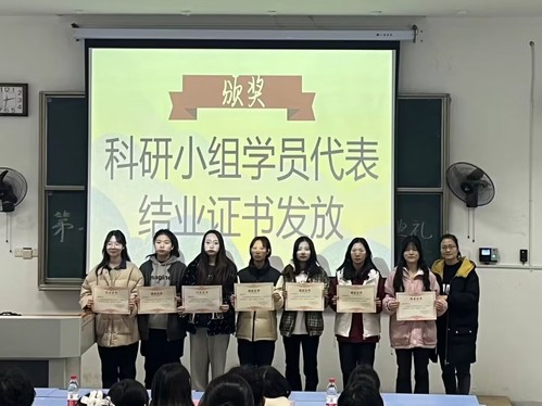 首先,由刘丽娟,学生会主席分别为活动致辞,并向同学们表达了真挚的期望与衷心的祝愿。其次,刘丽娟分别为学员代表颁发结业证书、荣誉证书,为导生颁发聘书。随后,第二十二届科研小组初级班优秀学员代表朱婕同学总结她在科研小组的学习经历,并向大家展示自己在科研小组的学习成果和心得。接着,社会实践调查大队的干事们为学员和嘉宾们带来精彩表演,活跃了现场气氛。最后,全体导生和学员在教育大楼门口拍照留念。