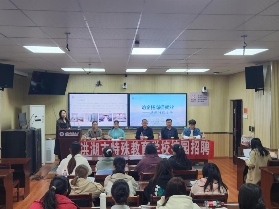 为进一步强化就业精准服务,促进毕业生高质量充分就业,教育科学学院组织策划“特别的岗位 “职”给特定的你”——特殊教育专业系列招聘活动。3月11日,教育科学学院在教育大楼1316会议室举行本次系列活动的首场招聘宣讲会。本次活动邀请到洪湖市特殊教育学校的领导老师一行来校进行招聘宣讲,招生与就业工作处副处长宋娜,学院党委副书记刘广兵,特教系教师张明平,特殊教育专业毕业生参加活动。