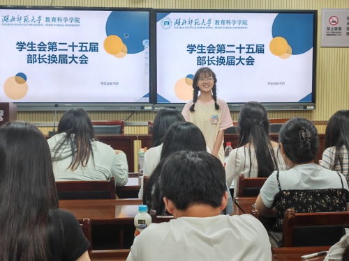 为了加强我院学生会组织建设,确保学生会工作顺利交接,教育科学学院于2024年5月28日晚在教育大楼1316A召开了第二十五届部长换届大会,参加本次大会的有第二十四届学生会主席宋米岍玥、翟彩云,第二十五届学生会主席刘施雨、刘诗雅,全体部长和参与竞选的干事。