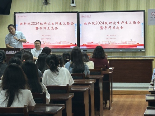 2024年9月12日晚7:00,教科院在教育大楼1316会议室召开了2024级研究生师生见面会暨师生互选会。会议由崔波副院长主持,学院班子成员、研究生导师、研究生秘书、研究生辅导员及2024级全体研究生参加了本次会议。