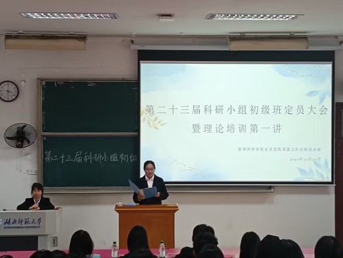 为促进新生对科研工作的认识、激发其学习兴趣,并增进同学们对彼此的了解,10月20日,教育科学学院社会实践调查大队于教育大楼1J22举办了第二十三届科研小组初级班定员大会暨理论培训第一讲。参加本次活动的嘉宾有大学生社会调查与实践中心秘书长段雅洁,教科院团委学生副书记雷伍娇、许广昊,学生会主席团成员之一刘诗雅。科研小组全体学员、导生参与了本次活动。