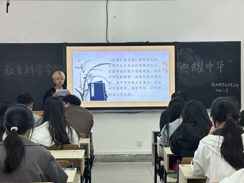 为贯彻落实《国家语委关于深入实施“典耀中华”主题读书行动的指导意见》精神,加快建设教育强国,引导我院学生加强经典书籍阅读,教育科学学院学习部于11月7日下午在教育大楼1201开展了“典耀中华”主题读书比赛活动。教育科学学院教学秘书谭燕军,辅导员伊力扎提、夏青腾作为本次比赛的评委莅临比赛现场。