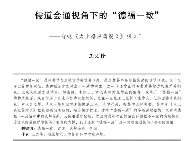 近日,国内权威期刊《世界宗教研究》发表了我校教育科学学院王文修博士在儒道哲学与宗教学交叉领域的最新研究成果。论文题为《儒道会通视角下的“德福一致”---俞樾<太上感应篇缵义>探义》。王文修博士为论文独立一作,湖北师范大学为论文第一单位。该期刊为中国社会科学院世界宗教研究所主办的宗教学专业学术刊物,AMI权威期刊。
