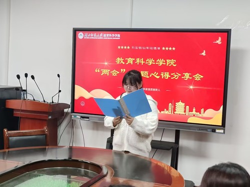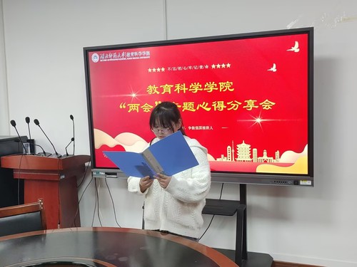 为深入学习和贯彻2025年全国两会精神,进一步汇聚奋进力量,教育科学学院于3月12日中午,在教育大楼1317会议室举办了“两会”专题心得分享会。团委学生副书记许广昊、青年传媒中心部长曾小函以及2024级心得分享同学共同参加了此次活动。