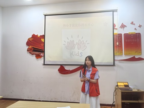 课程伊始,实践队员张嘉妮以孩子们熟悉的卡通形象为切入点,生动讲解了日常常见的喜、怒、哀、惧等基础情绪,用直观的画面帮助孩子们快速建立情绪认知框架。随后,她展示了一组印有不同表情的气球图片,引导小朋友结合刚学到的知识,为每个“情绪气球”贴上对应的情绪标签。在互动分享环节,张嘉妮邀请几位小朋友上台,分享自己对“开心”“生气”等情绪的理解,并结合他们的表达,简单讲解了负面情绪出现时的基础应对方法,自然过渡到课程核心环节——“扔掉坏情绪”。